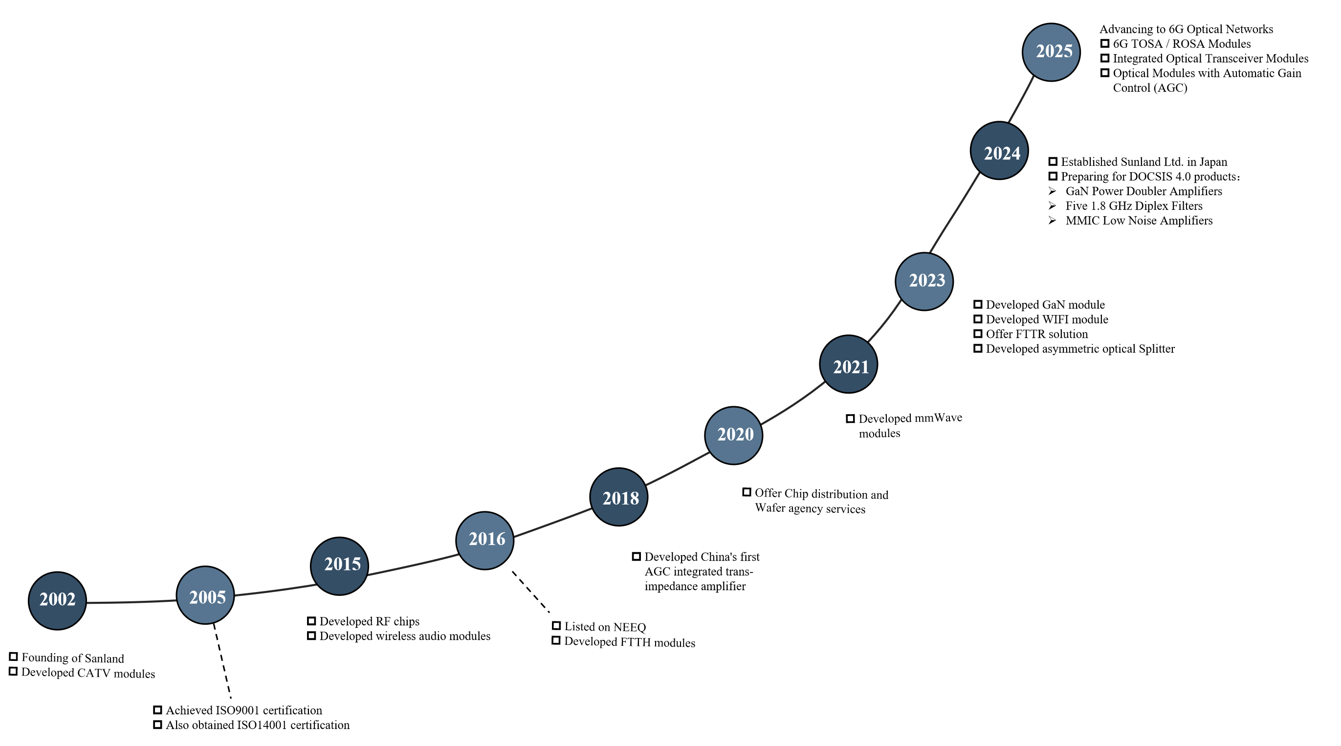 Shenzhen Sanland Technology Co., Ltd. es una empresa nacional de alta tecnología que integra fabricación, I+D, diseño y ventas. Desde su fundación en 2002, ha estado a la vanguardia de la tecnología de radiofrecuencia (RF). Nuestros principales productos y servicios incluyen chips de RF, módulos de RF, servicios de fundición de obleas, distribución de chips y radares de ondas milimétricas. Estos se utilizan ampliamente en diversos campos, como redes de televisión por cable, redes de comunicaciones móviles e IoT.